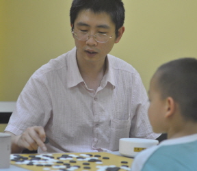 "How much you can drink is directly related to how strong you are," proclaimed Sun Bo, brimming glasses of both wine and beer in front of the amateur 5-dan. E-Journal photographer John Pinkerton and I had landed in Shanghai a few short hours earlier and Jin Sheng Yu (far left) and his wife Dai Zijia (far right) had picked us up and whisked us off to dinner with fellow go players Quin Zhixuan 5d (2nd from left), Du Yufeng 3P (3rd from right) and Sun Bo (3rd from left), who goes by "Jacky." We're in China to cover the 31st annual World Amateur Go Championships (WAGC), which start Monday in nearby Hangzhou and arrived a few days early to explore go in Shanghai. Feng Yun 9P had generously provided an introduction to Jin and though we had all just met, we were soon bonding over platters of Cantonese food, wine, beer and of course, go talk. Jin is a 4-dan pro in his early thirties who became a pro at 11 in 1990 who now works days at the Children's Palace and runs a go school on weekends. His wife, who insisted we call her Diana, teaches English at a Shanghai high school. Jacky, who we immediately nicknamed "Tough Jacky" because he confidently claimed to be strong at everything from go to ping pong, drinking and karaoke, is Jin's student and colleague at the weekend go school, which is so new — it just opened in March — that it hasn't been named yet. As we downed one delicacy after another — you haven't lived until you've sucked the fatty skin off chicken feet and slurped up glutinous rice balls in sweet red bean sauce — discussion ranged from the pros and cons of internet play ("anyone can get to 7-dan online") to how best to study pro games (split between some who said it was necessary to try to understand the moves and others said No, just play through the moves and try to get a feel for them). All agreed that at the top levels go is deeply mysterious and that questions of "good" and "bad" moves largely come down more to a sense of the game and style, rather than absolute assessment. After dinner we adjourned to Jin's club, near the famous Jingan Temple in downtown Shanghai, on the 6th floor of a nondescript office building. We could hear the chatter of young voices as we came out of the elevator and soon a dozen young go players were crowding around us, practicing their English and excitedly shaking hands. A few minutes later I was playing a simul with 7-year-old Zhu Qiying (l) and 8-year-old Zhang Chi (r), two young kyu players whose seriousness and poise was impressive. Zhu took up the game just 10 months ago on a dare from her classmates in school, and her twice-a-week lessons compete for her attention with dance, piano, English, skating, mathematics and other classes. Zhang — a rosy-cheeked youngster who also studies Chinese chess, piano and calligraphy — would like to be a pro and has been playing for two years. Jin has fifty young students already, and his instruction covers all aspects of go, "because you can't understand go without understanding its culture, as well." After the games and brief interviews and photos, the kids went home and we went into the teacher's room to check out the gambling go game Jacky and Zhixuan were playing. But that's another story.