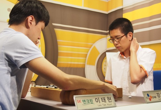 But Kang DongYun 9P from SK got very bad games and about to lose agaisnt Lee TaeHun. Even it wasn't end, Kang DongYun 9P was about to lose. And also Park SeongHwa lost against Kim SeDong and Kang SeongMin from SK team also lost. The score became 2 to 2 even suddenly. Now, there was last match beteen Kang DongYun from SK and Lee TaeHun from SK team. At this point, Kang DongYun 9P showed great patience in the game and waited for Lee 5P's mistakes one by one. When Lee 5P made one mistake, Kang 9P counterd it with great moves and sequence and turned it up for him in the end. Lee 5P couldn't believe it and also no power to play more. As this match up for both teams was very important as they are top 2 so far, CJ team got a path to be the No.1 while SK team should wait other teams' result. CJ E&M 3 vs 2 SK Enclean Kang DongYun (o) vs Lee TaeHun (x) Shin JinSeo (o) vs An SungJun (x) Lee jiHun (o) vs Park YoungHun (x) Park SeongHaw (x) vs Kim SeDong (o) Kang SeongMin (x) vs Hong MinPyu (o) |