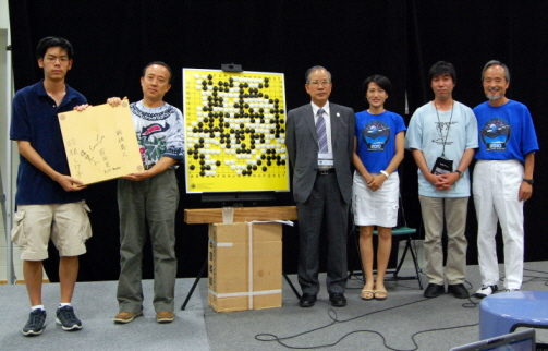 Huiren Yang 1P won the North American Ing Masters tournament last night, defeating Eric Lui 7D in a thrilling 3-point 4-hour marathon viewed by a rapt crowd of hundreds at the U.S. Go Congress as well as a worldwide audience that watched commentary by Yasumasa Hane 9P, Shigeko Hane 1P and Ryo Maeda 6P broadcast live on KGS as well as a live video feed of both the Board 1 game and the game commentary. After the game, the board used by the two players – a brand-new 2-inch Korean hiba table board – was signed by the players and pros and will be auctioned off at the Congress Banquet tonight to benefit the American Go Foundation. Click here for complete NAIM results and game records, including the Board 1 final (watch for the commented game to be posted on the website Saturday).