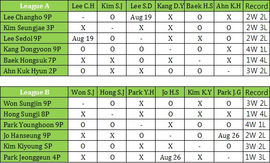 In league B, Park Younghoon 9P defeated Kim Kiyoung 5P and advanced to the semi finals of the 38th Myeongin having 4 wins and 1 loss, August 17. Therefore Kim Kiyoung who has 3 wins and 2 losses need to have another match. On August 12, in league A, Ahn Kukhyun 2P won against Kang Dongyoon 9P who has already advanced to the semi finals. Since Ahn Kukhyun has 3 wins and 2 losses, he also needs to wait for another match, and his opponent will be the winner the match on August 19 between Lee Changho 9P and Lee Sedol 9P.